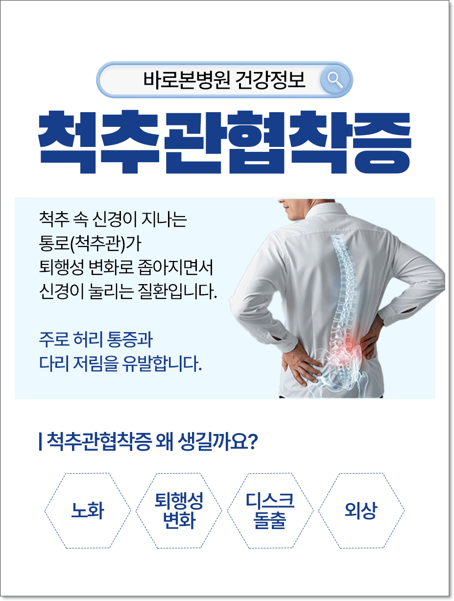 척추관협착증은 척추 속 신경이 지나가는 통로, 즉 척추관이 여러 가지 원인으로 좁아지면서 신경이 눌려 다양한 증상이 나타나는 질환을 말합니다.