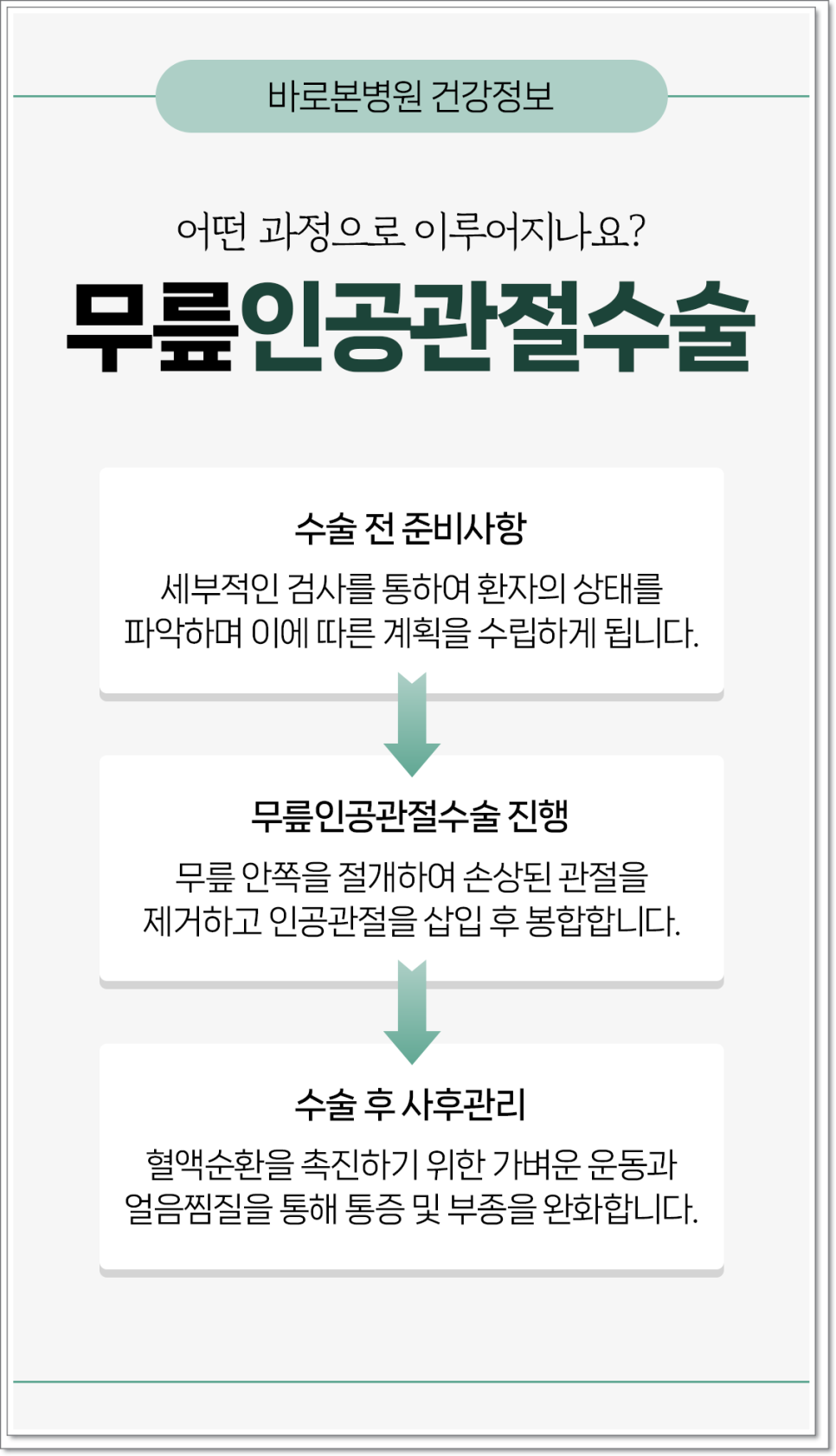 환자분들께서는 수술이 필요한 시점을 정확히 아는 것이 먼저이고, 이후 어떤 과정을 거치며 어떤 생활 관리가 필요한지 숙지하는 것이 회복에 큰 도움이 됩니다. 특히 수술 후에는 “무릎이 회복하는 과정에 맞추어 점진적으로 생활을 조절하는 것”이라고 말씀드리고 싶습니다. 즉, 갑작스러운 회복을 기대하기보다는 차근차근 단계를 밟아 나가는 것이 필요합니다.