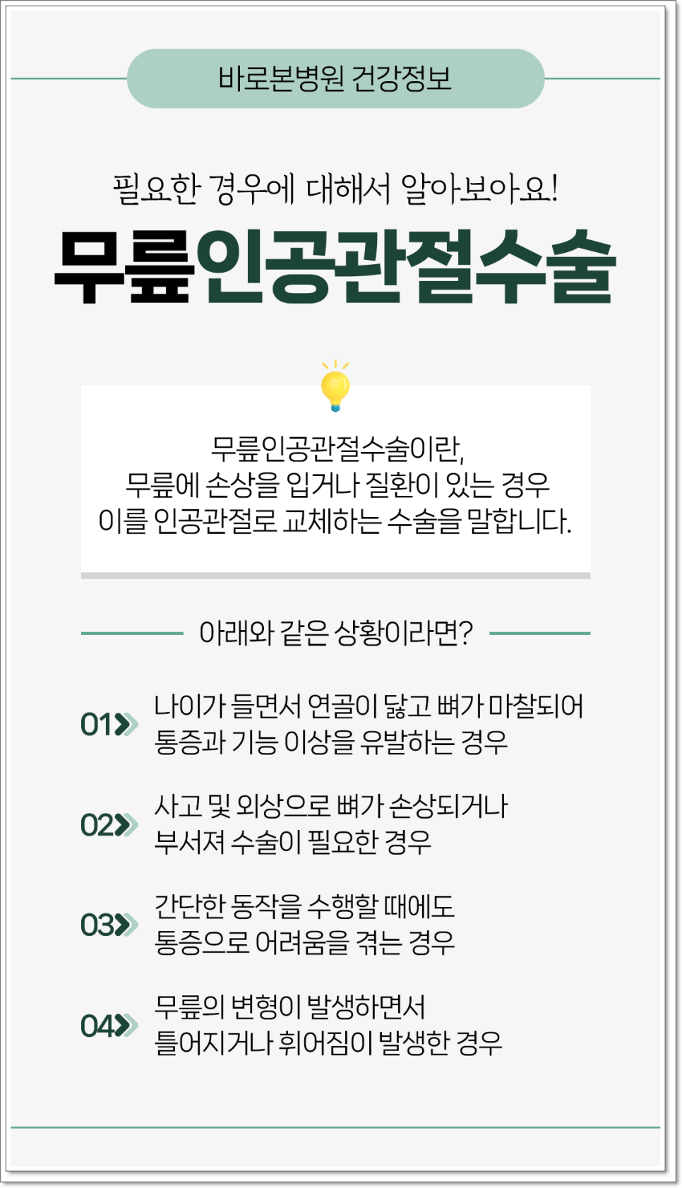 마지막으로 환자분들께 당부드리고 싶은 점은 무릎 인공관절 수술이 본인에게 꼭 필요한지, 수술 이후 어떤 생활 관리가 가능한지 충분히 이해하신 뒤 결정하시라는 것입니다. 의료진과 충분히 상담하고, 수술 이후에도 꾸준히 관리해 나간다면 통증으로 인한 불편을 줄이고 더 나은 일상생활을 유지하는 데 큰 도움이 될 것입니다.