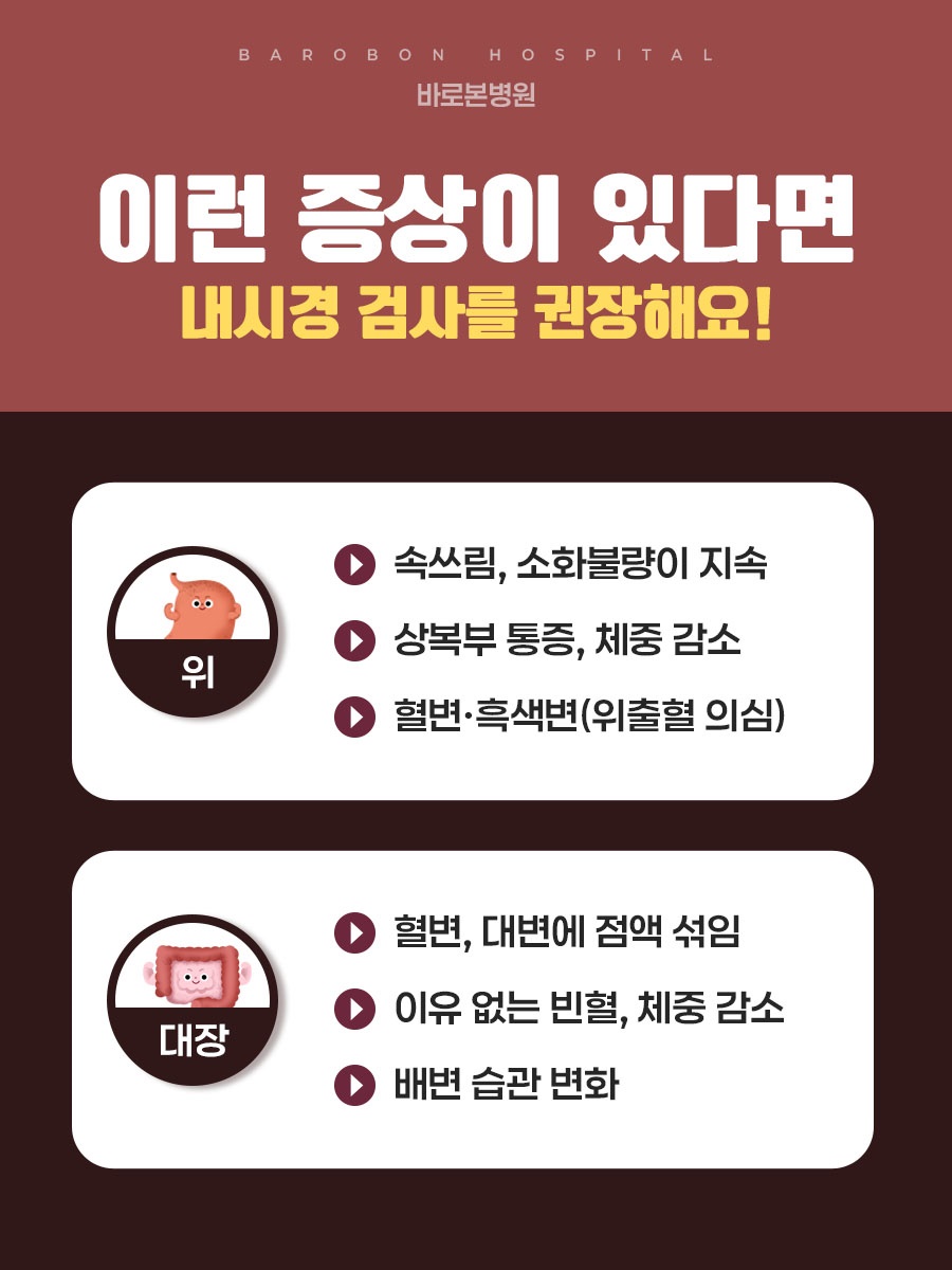 그렇다면 어떤 증상이 있을 때 위·대장 내시경 검사를 고려해야 할까요? 위의 경우에는 속 쓰림이나 소화불량이 반복되거나, 상복부 통증이 지속되는 경우, 특별한 이유 없이 체중이 감소하는 경우가 있습니다. 또한 혈변이나 흑색 변이 동반된다면 위장관 출혈을 의심해야 하므로 반드시 검사가 필요합니다. 대장의 경우에는 혈변이나 대변에 점액이 섞여 나오는 경우, 배변 습관이 갑자기 달라지는 경우, 이유 없는 빈혈이나 체중 감소가 발생하는 경우, 또는 가족 중 대장암 병력이 있는 경우 내시경 검사가 권장됩니다.