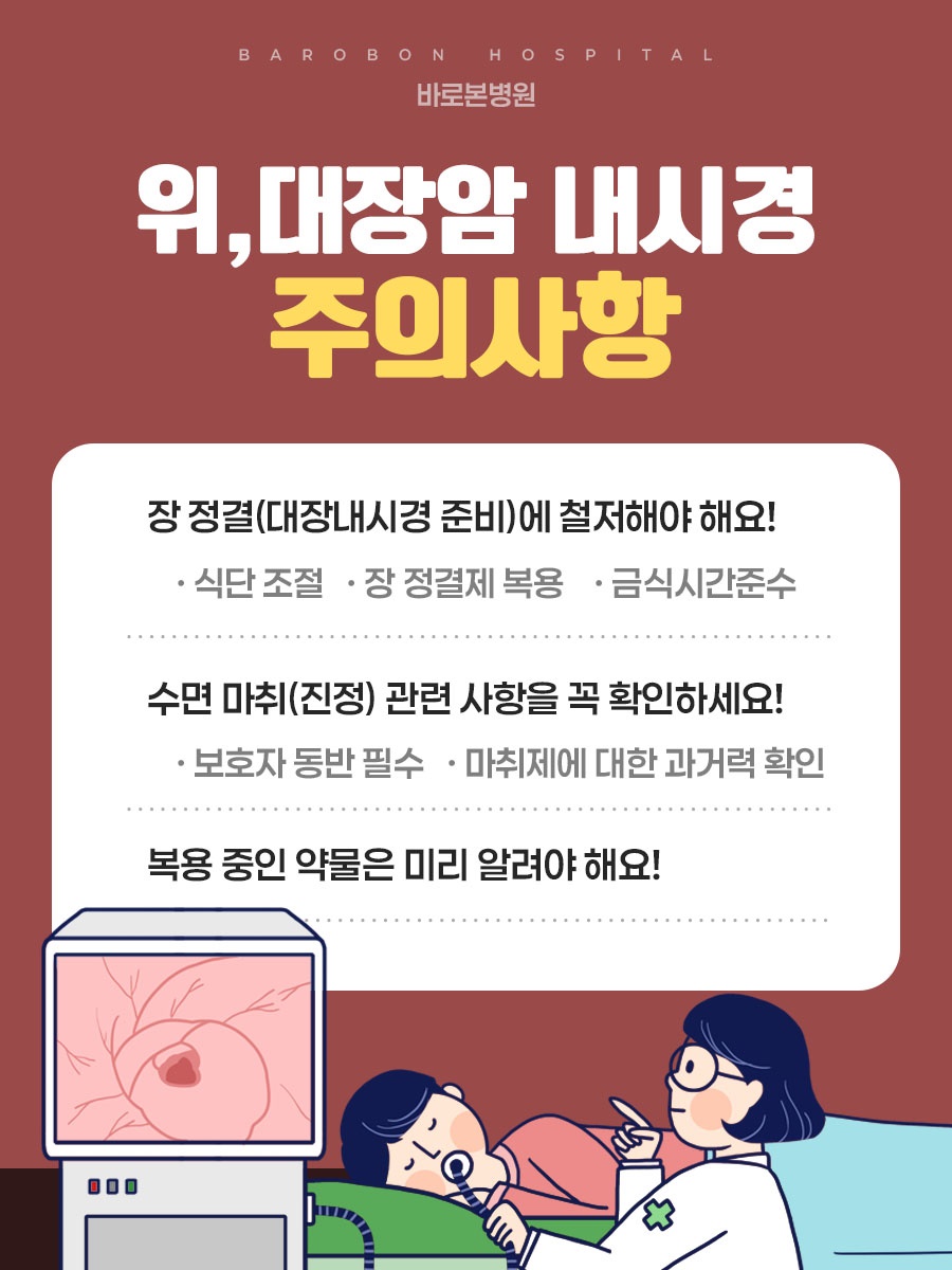 내시경 검사를 받을 때는 몇 가지 준비와 주의 사항이 필요합니다. 위내시경의 경우 검사 전 일정 시간 금식이 필요하며, 대장 내시경은 장을 깨끗이 비워야 하므로 장 정결제를 복용해야 합니다. 준비가 충분하지 않으면 장 속이 깨끗하지 않아 병변을 놓칠 수 있기 때문입니다. 또한 수면 내시경을 선택하는 경우가 많아 마취제 사용에 대한 과거력이나 알레르기 여부를 반드시 알려주셔야 합니다. 보호자 동반이 필요하다는 점도 기억하셔야 합니다.