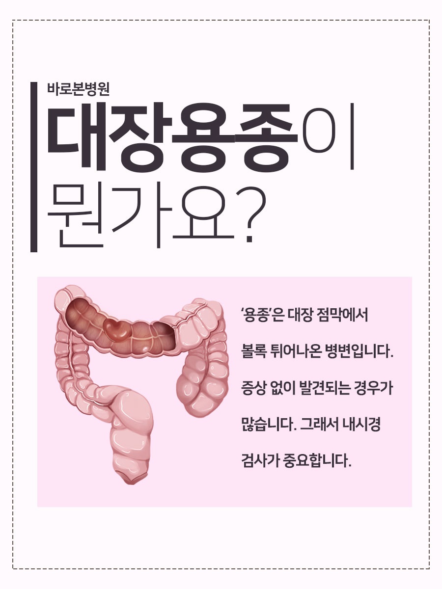 본인이 겉으로 느끼는 증상이 없더라도 내시경에서 용종이 발견되는 경우가 흔하기 때문에 증상 여부만으로 판단하지 않으셨으면 합니다.