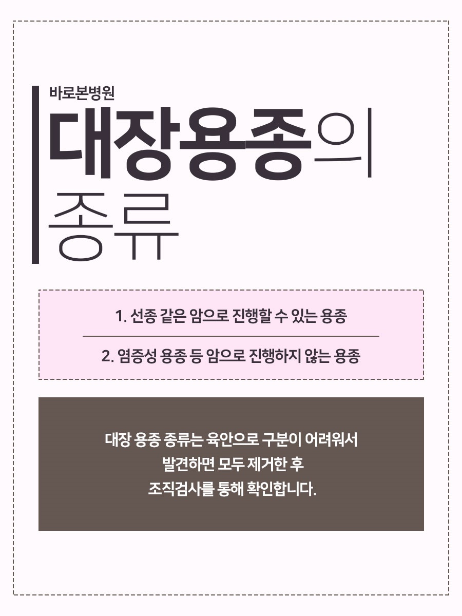 오늘 말씀드린 것처럼 대장용종 종류는 육안으로 구분이 어렵기 때문에 발견하면 제거 후 조직 검사로 확인하는 것이 현재까지의 표준적인 방법입니다.