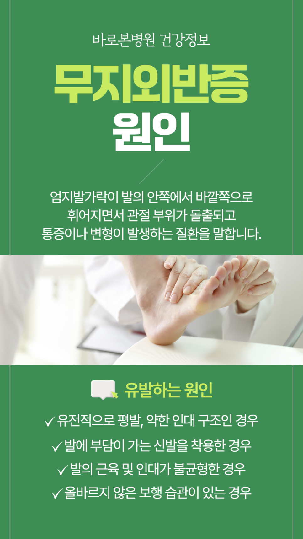 또한 바른 보행 습관을 유지하지 못하는 경우에도 발의 구조에 부담이 가면서 증상이 나타날 수 있습니다.